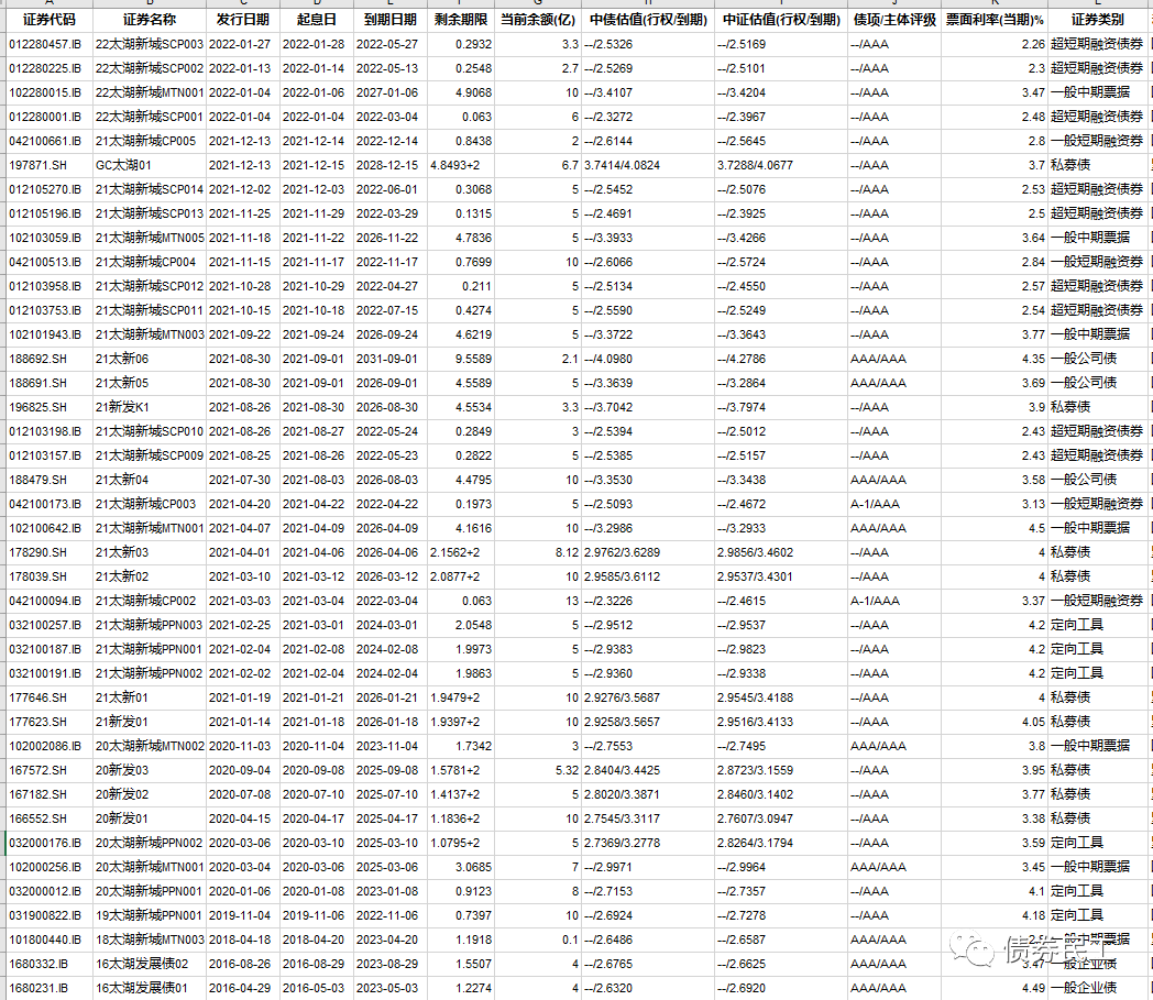 太湖新城最新的主體信用等級(jí)為AAA(上海新世紀(jì)、大公國(guó)際和聯(lián)合資信)。太湖新城目前存量債券金額為242.64億元,存量債券只數(shù)為40只,債券品種包括企業(yè)債券、公司債券和債務(wù)融資工具等。