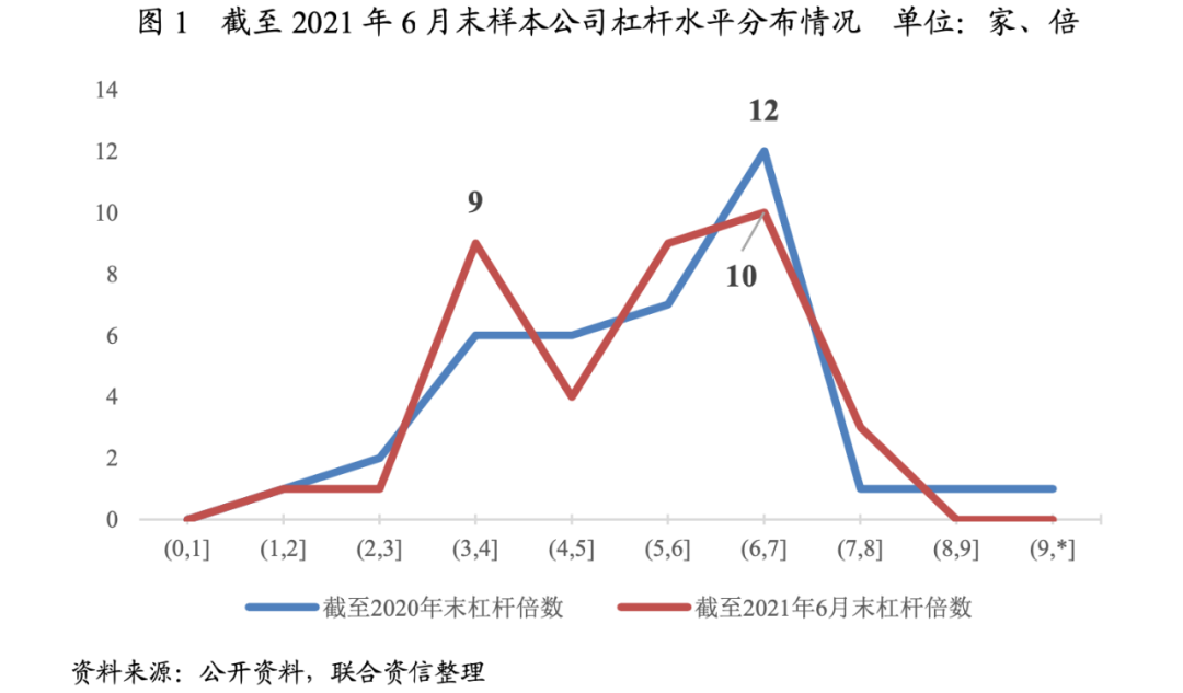 杠桿倍數(shù)不超過8倍。以2020年末數(shù)據(jù)為基礎(chǔ),樣本公司[2]中杠桿倍數(shù)[3]超過8倍的有2家,并且這2家樣本公司2021年以來杠桿倍數(shù)均出現(xiàn)下降。截至2021年6月末,樣本公司的杠桿倍數(shù)均小于8倍。從下圖來看,截至2021年6月末,樣本公司杠桿倍數(shù)主要分布在3~4倍和在6~7倍。同時,2021年以來,樣本公司杠桿倍數(shù)整體偏移到較小區(qū)間,大部分樣本公司杠桿水平控制在合理范圍之內(nèi)。