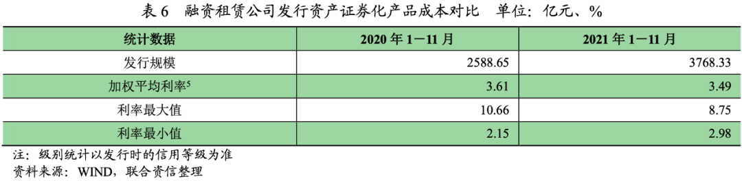 根據(jù)WIND統(tǒng)計,2021年1-11月,融資租賃公司發(fā)行資產(chǎn)證券化產(chǎn)品合計3768.33億元,較上年同期(2588.65億元)上升45.57%。