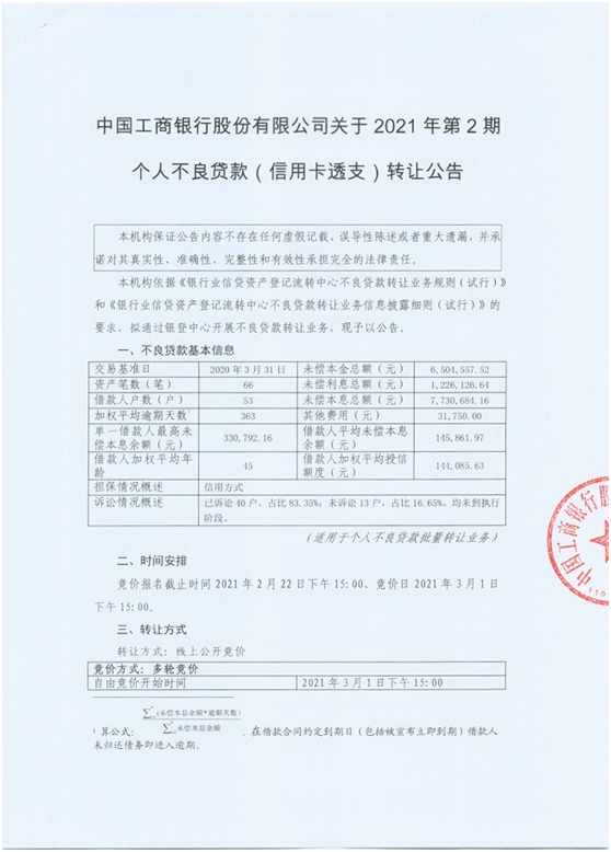 工商銀行第3期轉讓的標的亦為信用卡透支類不良貸款,共31戶(32筆),均未訴訟,逾期天數(按未嘗本息總額加權平均)168天。未嘗本金總額約2825萬元,未嘗利息總額約277萬元,未嘗本息總額約3102萬元,競價起始價0元,加價幅度10萬元。