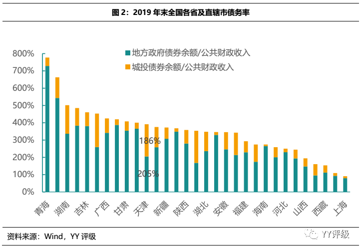 基建開發(fā)如火如荼帶來(lái)債務(wù)規(guī)模的擴(kuò)張,2019年末天津市地方政府債券余額為9,433億元,此為顯性債務(wù);區(qū)域內(nèi)城投債券余額為4,486億元,此為隱性債務(wù)的一部分。此前,YY團(tuán)隊(duì)曾分別采用負(fù)債端和資產(chǎn)端資金來(lái)源兩種方法對(duì)省級(jí)單位的隱性債務(wù)進(jìn)行了測(cè)算,負(fù)債端測(cè)算得到天津2018年末隱性債務(wù)余額為1.878萬(wàn)億元,資產(chǎn)端測(cè)算得到1.702萬(wàn)億元。以債務(wù)率指標(biāo)對(duì)全國(guó)31個(gè)省級(jí)單位進(jìn)行橫向?qū)Ρ龋旖虻膮^(qū)域債務(wù)總額/公共財(cái)政收入比率為391%,相對(duì)債務(wù)壓力排名靠前。