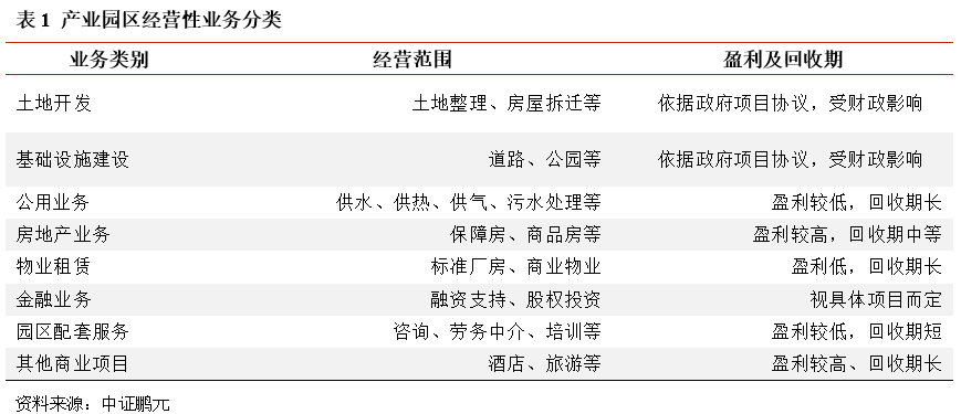 不同發展階段的產業園區,催生著不同的業務模式需求。一般而言,因為地區資源稟賦、經濟發展水平的不同,產業園區存在著初創期、發展期、成熟期等不同的發展階段。對于初創期的園區開發業務,圍繞政府產業規劃、招商引資政策,集中在基礎設施代建、土地開發整理等方面,收益主要源自于政府的代建收入,市場化程度不高。隨著園區入駐企業的增多,廠房、物業需求增加,城投公司逐步拓展至相關產業地產開發業務,如標準廠房、公寓、商業寫字樓等建設,收益主要源自于物業出售、租賃等。最終在產業聚集完成后,園區步入成熟階段,入駐企業的各項金融、信息、技術服務需求增加,城投公司以服務和管理為收益來源的業務將會增長。