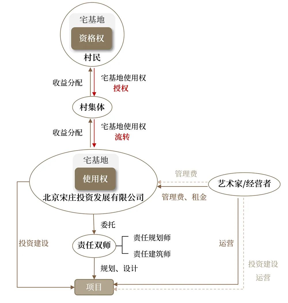 宋莊創新宅基地經營權市場化流轉創新模式,將宅基地使用權流轉到鎮級公司平臺——北京宋莊投資發展有限公司(以下簡稱:宋投公司)。由宋投公司對宅基地進行統籌、管理、經營,避免村民與藝術家、經營者產生直接矛盾沖突,控制房屋價格。