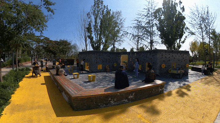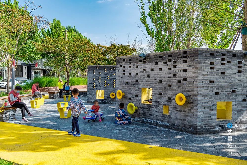 灰磚和暖黃鋪裝在色彩上碰撞融合,剛硬的底色上傳達出了溫暖和樂觀的感覺,也與公園內的法桐樹、銀杏樹遙相呼應,深秋葉黃,必是一番好景致。穿孔灰色墻磚又與穿孔耐候鋼、不銹鋼雕塑交替組合,則在構件上實現了傳統與現代交融的層次感。