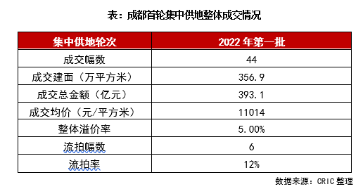 4月2日,成都為期3天的集中供地落下帷幕,本年度首輪集中供地出讓完成。本次成都土拍共成功出讓44宗含宅用地,總成交金額為393.1億元,總建面達到356.9萬平方米,6宗地塊流拍,流拍率12%,較2021年的后兩次集中供地有所回落,市場逐步企穩。