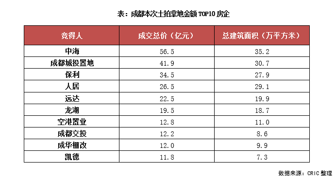 從拿地房企來看,本次成都土拍雖然吸引了較多房企參拍,但主力依然是大型國企、央企,其中中海、保利表現搶眼,各自斥資56.5億元和34.5億元,分別拿下3宗、2宗地塊,中海也是本次土拍中拿地金額最高的房企。此外,諸如金茂、中交、國貿等也在成都首輪集中供地中有所斬獲。