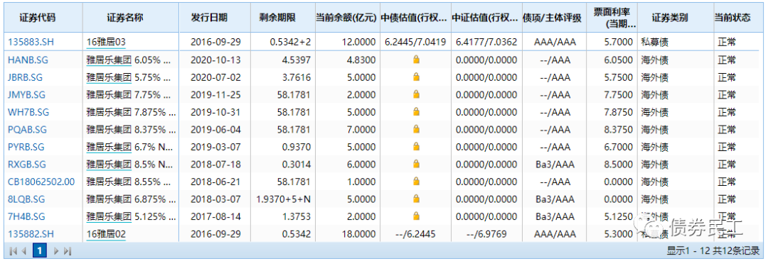 雅居樂集團為香港上市公司(股票代碼3383.HK),實際控制人為陳卓賢為代表的陳氏家族,國內(nèi)主體信用評級為AAA。目前在國內(nèi)存續(xù)兩只私募債券,總規(guī)模30億元;其余債券均為境外債券。