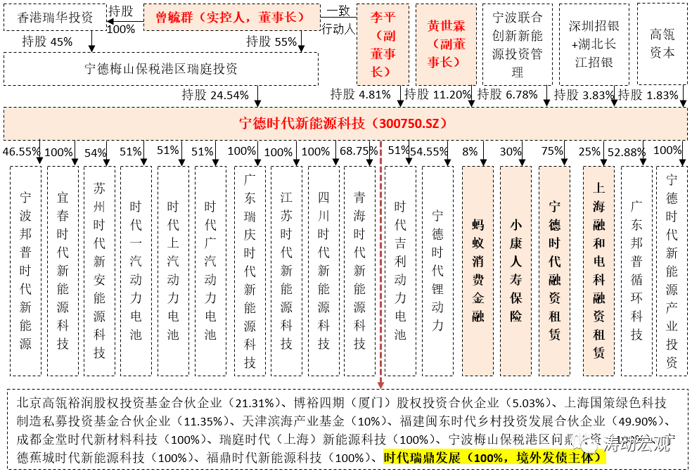 1、畢業于中科院物理研究所的曾毓群為寧德時代的創始人,位居2021年胡潤中國百富榜第三位,目前擔任寧德時代的董事長并為其實控人,主要通過寧德梅山保稅港區瑞庭投資來實現對寧德時代的控制,合計持股比例達到24.54%。