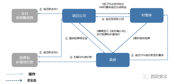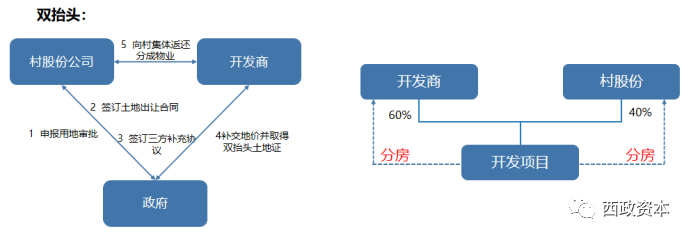 需注意的是,單抬頭的合作模式下,因項目公司分配給村股份公司的物業(yè)無法做稅前扣除,因此在土地成本(如非農(nóng)或征返用地的出讓金)很低的情況下綜合稅負就會高很多,另外開發(fā)商完成項目的開發(fā)建設(shè)并在分配物業(yè)的過程中,因項目公司分配給村股份公司物業(yè)需按視同銷售處理,因此在土地成本很低的情況下相當于開發(fā)商還要額外掏出現(xiàn)金去繳納分配物業(yè)過程中的巨額稅費,由此就催生了雙抬頭的合作模式。