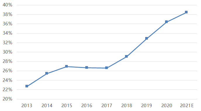 2、居民人均可支配收入增速在2020年顯著下滑,由前一年9%左右下滑至當年5%左右。預計2021年仍將保持低位。國家統計局2019年及以后已不再公布可支配收入總量數據,但歷史上可支配收入占GDP比重非常穩定,在56-60%之間,去年由于GDP增速低于人均可支配收入增速,估算可支配收入占GDP比重略高于60%。