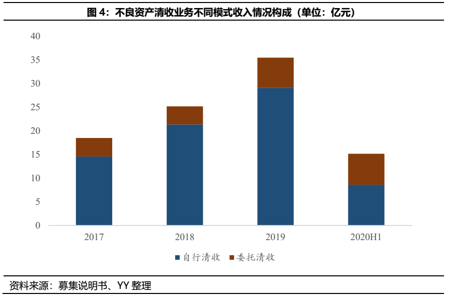 具體業務模式上,公司通過自行清收及委托清收兩種模式來實現不良資產處置,委托清收模式主要是公司成立之初不良資產處置經驗及能力不足時用于規模擴張的權宜之計,目前公司已不再新增委托銀行清收類業務(接受其他金融機構委托的模式仍在延續),對現有存量逐步消化,收益更高的自行清收模式成為主角。