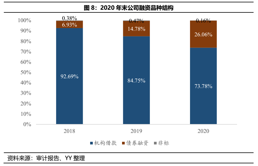 從債務品種來看,銀行借款仍然是公司最主要的融資來源,近年來債券融資占比有所提高,非標融資規模很小,整體融資結構較健康。