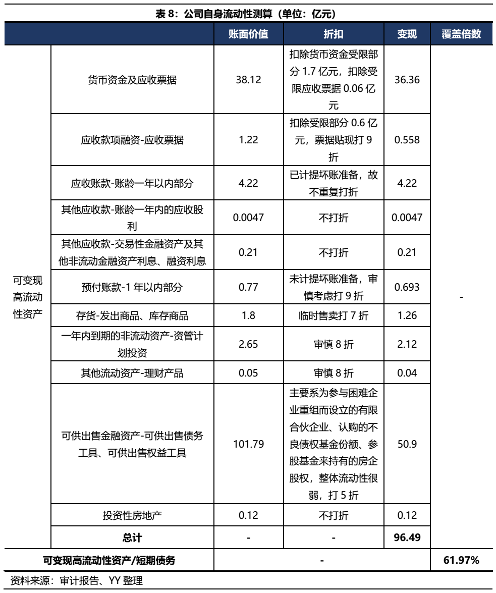 據測算結果,極限變現的情況下,公司自身流動性對短期債務的覆蓋程度僅有61.97%,尚存在59.21億元資金缺口有待備用流動性即再融資的補足。