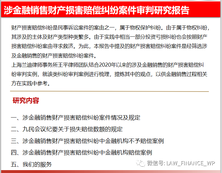 上海蘭迪律師事務(wù)所王平律師團(tuán)隊(duì)結(jié)合2020年以來的涉及金融銷售的財(cái)產(chǎn)損害賠償糾紛審判實(shí)例,就該類糾紛審判案例進(jìn)行梳理,提煉其中的裁判要旨等,以供金融銷售過程相關(guān)方在實(shí)踐中參考。本次研究的對(duì)象為自2020年以來涉及金融銷售的財(cái)產(chǎn)損害賠償糾紛司法案件判決書。