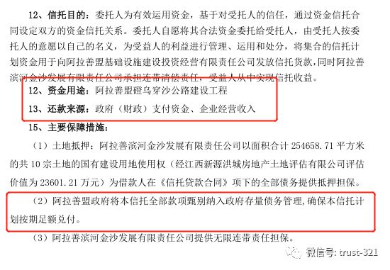 項目本身是一個常見的基建類信托,資金用于公路建設(shè),彼時對政府三件套之類尚未嚴厲約束,風控中有一個“將信托全部款項納入政府存量債務管理”的措施(背后應當有紅頭文件支持),也就是明確了該筆借款屬于“政府債務”。