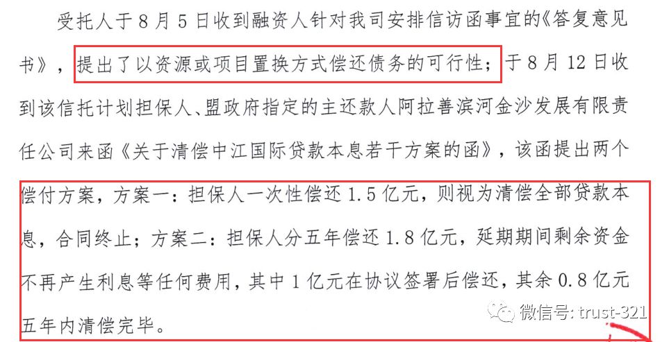 大家來“品一品”這個借款人多么強硬:先是要求以資源或項目置換(好奇用什么置換,難道是阿拉善的梭梭樹嗎……),估計遭到管理人拒絕后提出兩個方案: