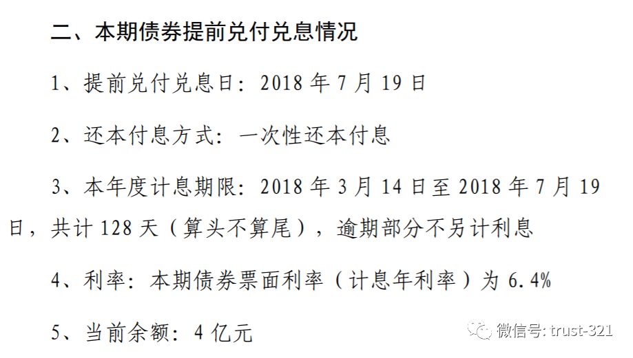 其次是債券提前償還。銀象350盡調(diào)資料中提到,融資人2013年4月發(fā)行了10億公司債券,該債券期限7年,本應晚于信托到期日;但該債券在2018年7月提前兌付且在7月19日摘牌,導致實際上的償還日早于信托到期日。