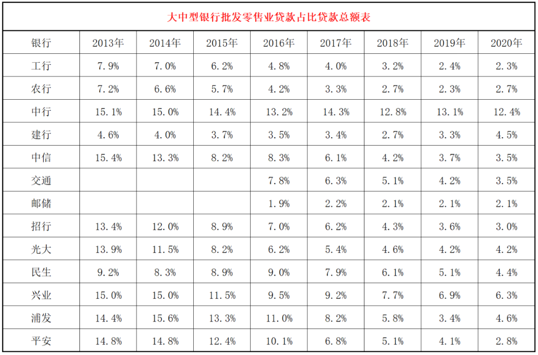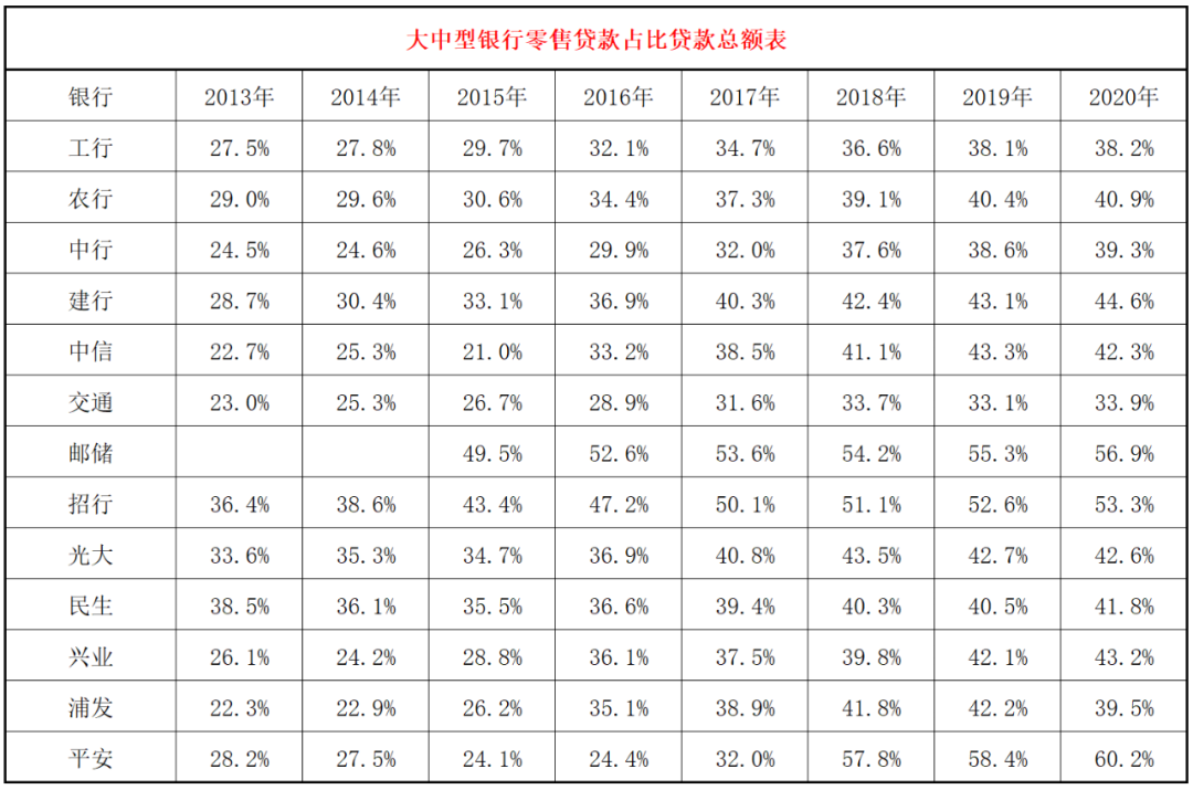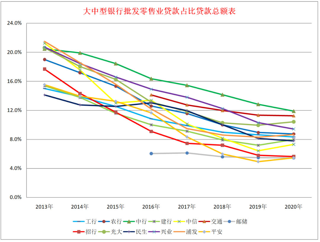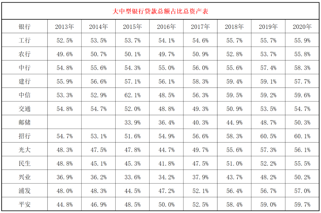 我們統計了13家大中型銀行過去八年貸款與總資產的占比、零售貸款與貸款總額的比值,制造業貸款與貸款總額的比值,批發零售業貸款與貸款總額的比值,按揭貸款與貸款總額的比值。