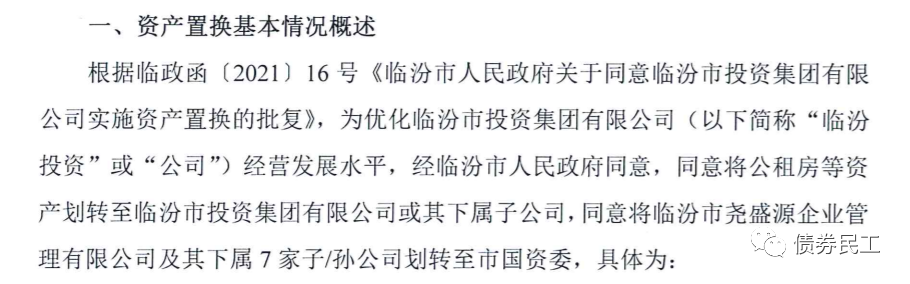 3、根據(jù)臨汾市投資集團(tuán)有限公司2021年6月4日發(fā)布的公告,通過(guò)了持有人會(huì)議決議,擬將臨汾市的公租房等資產(chǎn)用于置換公司的 臨汾市堯盛源企業(yè)管理有限公司及其下屬7家子/孫公司等劃轉(zhuǎn)至臨汾市國(guó)資委。公司的控股股東是和實(shí)際控制人是臨汾市國(guó)資委。公司的主體信用評(píng)級(jí)為AA+,存續(xù)債券9只,存續(xù)債券金額為73億元。