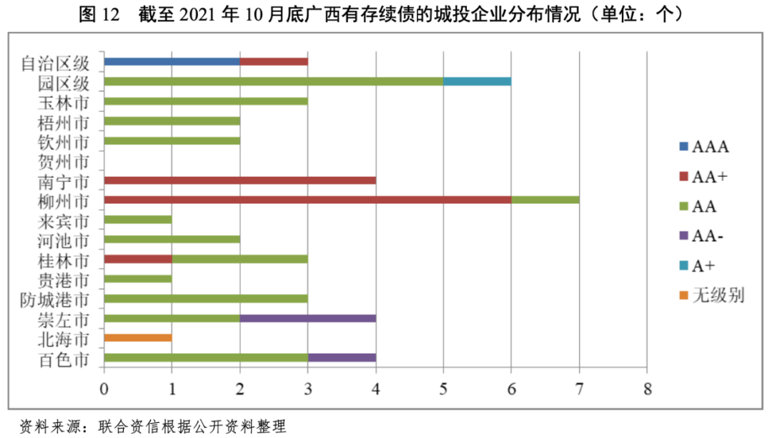 廣西發債城投企業主要為地級市城投企業,區縣城投企業較少,柳州市為廣西發行城投債最多的地區。廣西發債城投企業的信用等級普遍集中在AA級別。