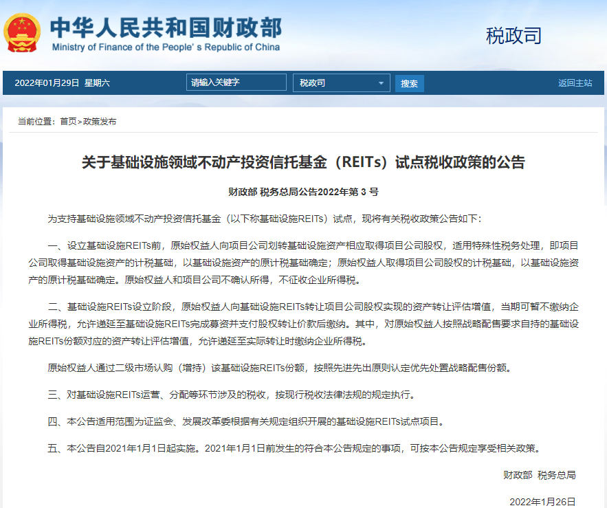 關于基礎設施領域不動產投資信托基金(REITs)試點稅收政策的公告