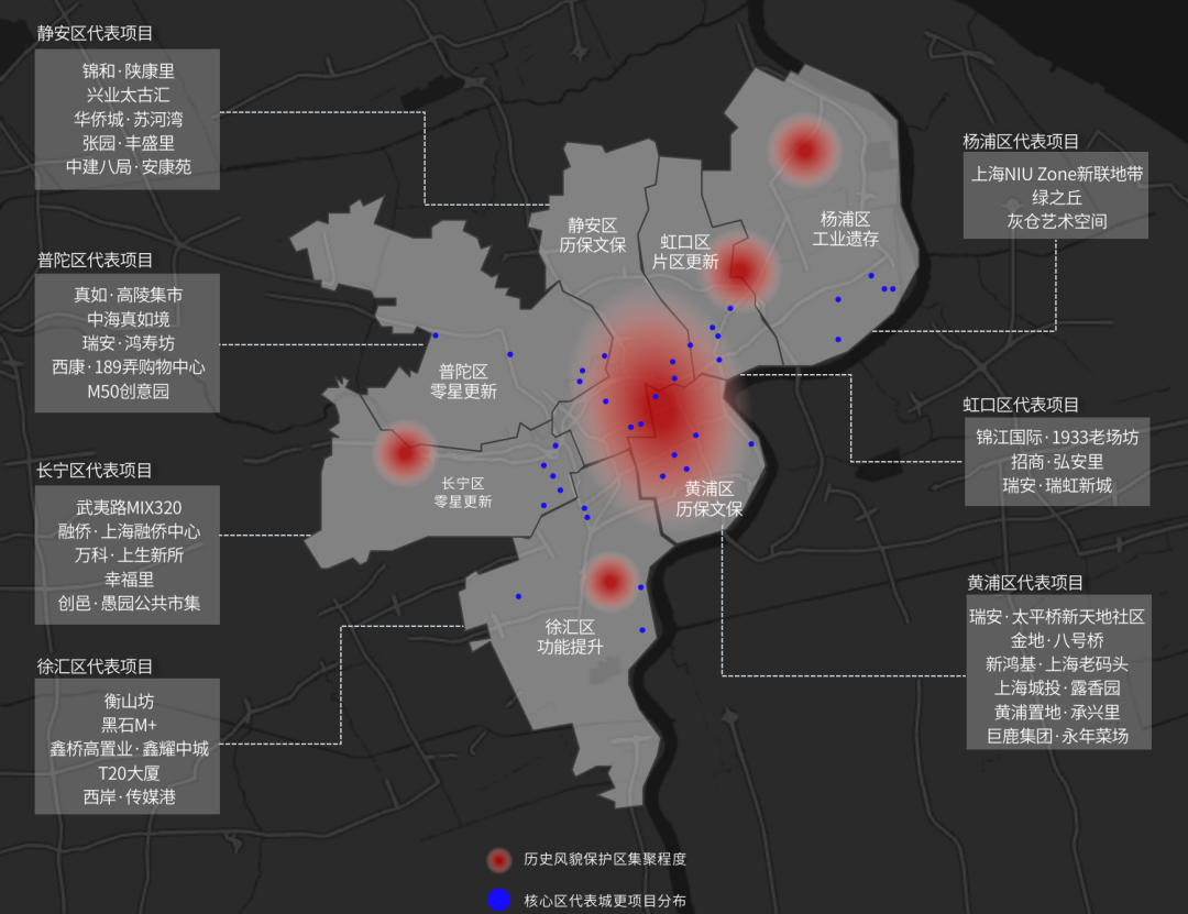 圖:上海歷史風貌保護區集聚程度及各區代表城更項目