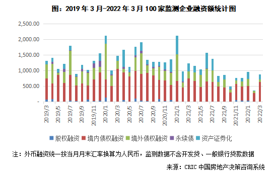 2022年3月100家典型房企的融資總量為878.39億元,環(huán)比上升138.7%,同比下降29.1%。融資量環(huán)比有較大的增長,同比降幅收窄,主要在于年初政策暖風(fēng)頻吹,3月六部委又就房地產(chǎn)問題進(jìn)行發(fā)聲,促進(jìn)房地產(chǎn)業(yè)良性循環(huán)和健康發(fā)展,促進(jìn)企業(yè)融資恢復(fù)。從融資結(jié)構(gòu)來看,境內(nèi)債權(quán)融資641.18億元,環(huán)比上升125.2%,同比下降15.0%;境外債權(quán)融資72.93億元,環(huán)比上升27.6%,同比下降65.7%;本月資產(chǎn)證券化融資164.28億元,環(huán)比上升526.8%,同比下降39.6%,大部分是國企央企,融資意愿有所上升。