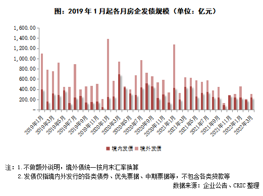 3月發(fā)債315.4億元,環(huán)比上升44.5%,同比下降50.5%。其中,境外發(fā)債72.9億元,環(huán)比上升195.1%,同比下降59.9%,本月景瑞控股完成了1.71億美元優(yōu)先票據(jù)的交換要約,以及正榮地產(chǎn)完成了7.29億美元和15.9億元人民幣優(yōu)先票據(jù)的交換要約發(fā)行。境內(nèi)發(fā)債242.5億元,環(huán)比上升25.3%,同比下降46.8%,其中,公司債發(fā)行45.9億元,環(huán)比上升6.74%,同比下降78.3%;中期票據(jù)發(fā)行117.6億元,環(huán)比下降11.8%,同比下降4.9%;融資券發(fā)行79.0億元,環(huán)比上升359.3%,同比下降34.2%。境內(nèi)發(fā)債主體仍以國企央企為主,民營房企中,萬科和旭輝分別發(fā)行了19.9億元的公司債和10億元的中期票據(jù)。