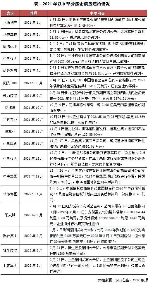 在債務(wù)違約方面,本月7日、21日和27日禹洲集團(tuán)、祥生控股和上置集團(tuán)分別發(fā)布公告稱旗下債券未能按期支付利息,構(gòu)成了實(shí)質(zhì)性違約,單月曝出債務(wù)違約的房企數(shù)量是2021年以來之最,未來仍有可能有更多房企曝出債務(wù)違約事件。