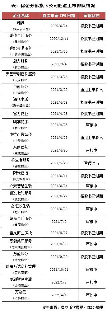 在房企分拆旗下公司上市方面,期后萬科旗下的物業(yè)服務(wù)公司萬物云在4月1日正式向港交所申請上市,此外融匯悅生活和蘇新美好服務(wù)分別在3月21日和4月4日更新了招股書,因此截至2022年4月6日,在港交所遞交過招股書而仍未上市的房企旗下公司共有23家,其中有多家企業(yè)的招股書都已過期,未來是否還會堅(jiān)持上市有待觀察。