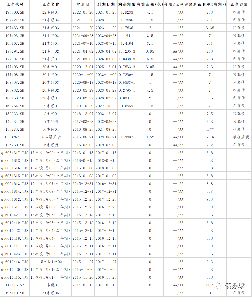 豐縣經(jīng)開累計發(fā)行37只債券(產(chǎn)品),其中交易所非公開公司債19只、企業(yè)債1只、天交所產(chǎn)品17只。這里的天交所產(chǎn)品名稱為私募債券,對于這樣的稱呼,筆者以為值得商榷,因此就用產(chǎn)品進行了替代。目前,風(fēng)險經(jīng)開存續(xù)的債券有14只,1只企業(yè)債和13只非公開公司債。