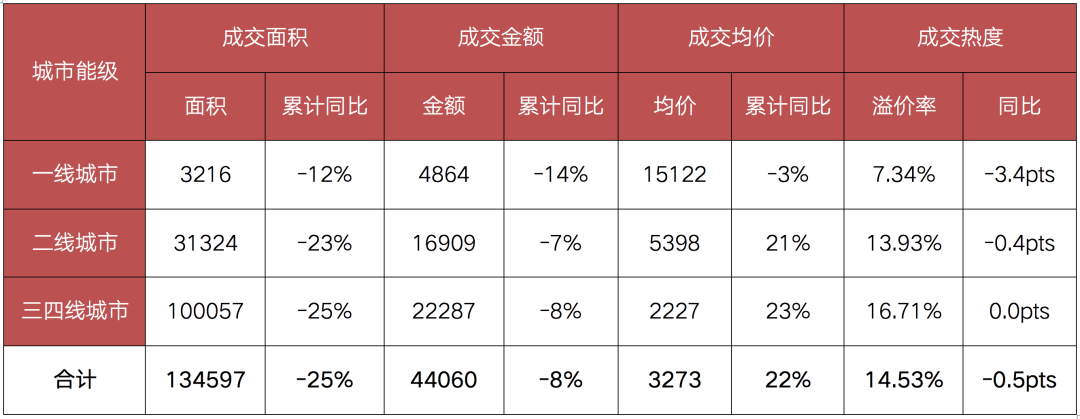 分城市能級來看,各能級城市成交表現(xiàn)均不及二季度,尤其是一線城市,三季度成交量環(huán)比下滑了89%,同比降幅也高達79%;二線、三四線城市成交建面也環(huán)比分別下降65%和20%,供地量較二季度明顯在縮減。受集中供地政策的影響,各能級城市前三季度表現(xiàn)均不及同年同期,尤其是三線城市,同比去年同期降幅高達25%,供地力度明顯減弱。