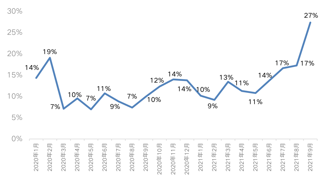 自下半年以來,房地產(chǎn)行業(yè)資金環(huán)境明顯收緊,同時7月末以來以22個集中供地城市為代表的重點城市紛紛調(diào)整了供地規(guī)則,尤其加強了對房企購地資金和競拍資格的審查。在此影響下,第三季度房企拿地積極性明顯受挫,福州、成都、天津、濟南、青島等多個集中拍地的城市均有多宗土地遭遇中止出讓,金華、嘉興等熱點城市的集中土拍也遇冷,導(dǎo)致第三季度土地流拍現(xiàn)象顯著增多,9月重點城市的土地流拍率已飆升至27%。