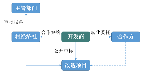 舊村改造項目中,由于合作方在當地與村民具備較好的溝通基礎及渠道,開發商通常委托平臺公司完成轉化階段的部分工作,以廣州為例,舊村改造的平臺公司義務范圍包括:協助開發商與村經濟社簽訂更新改造合作意向書并取得村民(股東)代表表決通過;推進項目前期基礎數據摸查、編制更新改造實施方案;協調推進村民(股民)表決通過委托設計單位編制的項目更新改造實施方案并獲得政府職能部門批復;協助開發商通過公開程序成為合作項目中標的合作企業及合作項目開發主體;協助開發商簽署土地出讓合同取得融資地塊土地使用權;協助開發商完成合作項目的房屋拆遷及合作項目的開發報建手續、物業交付手續等。
