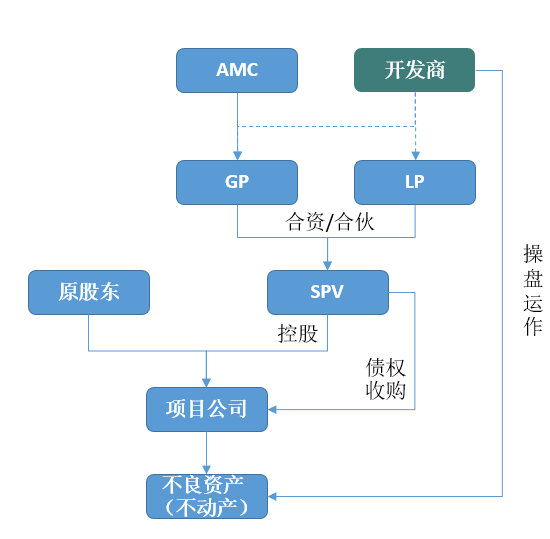 AMC下屬公司(作為GP)與房地產企業及其他投資人(作為LP)共同成立專業地產特殊機會SPV(基金或非基金方式),或由AMC下屬公司和房地產企業可選擇合資成立專業不良資產管理主體(作為GP,使該管理主體既具備較強的投融資能力,又具備較強的地產項目操盤能力和品牌影響力),該管理主體與其他投資人成立SPV,對房地產不良資產項目的債權(尤其是金融債權)進行收購重組,并取得項目公司的控股權。