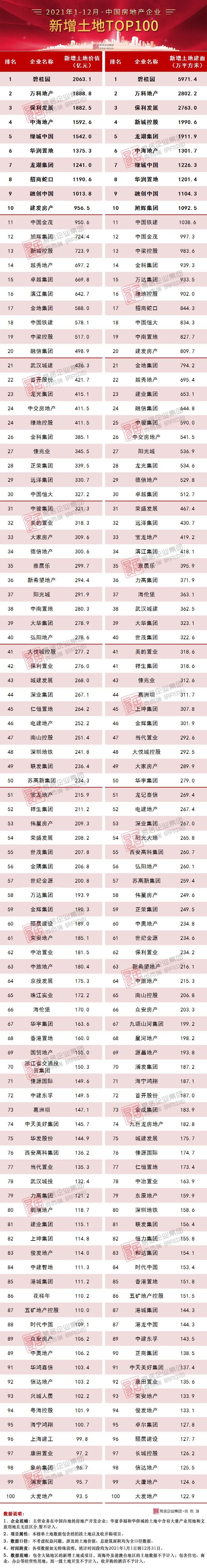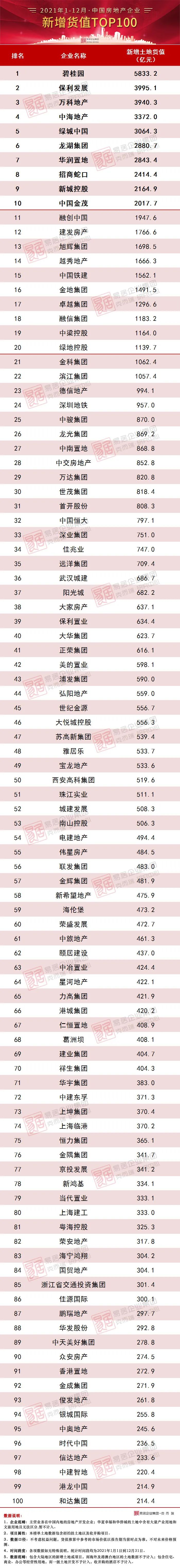 原標題: 2021年中國房地產企業新增貨值TOP100排行榜