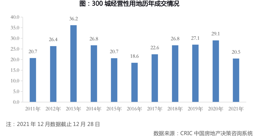 截止到12月28日,全國300城土地市場成交建筑面積20.5億平方米,較2020年同期下降了22%。與土地成交規模變動走勢一致,成交金額較去年同期也明顯收縮,全國土地總成交金額62494億元,同比去年同期下降了10%。