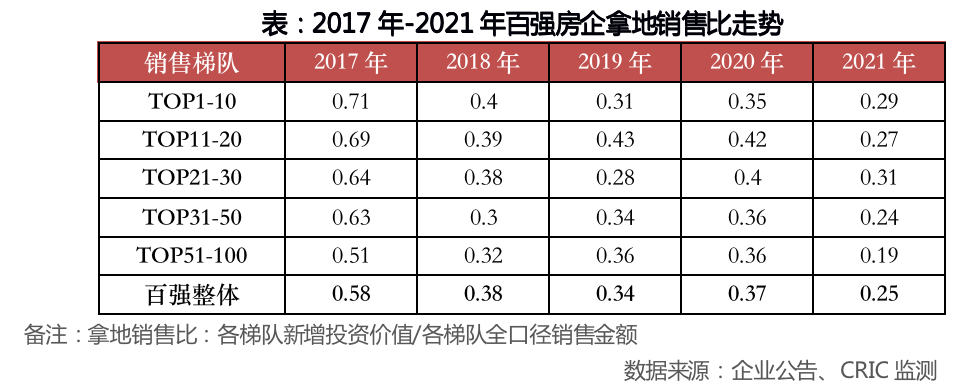 從歷年拿地銷售比變化來看,也足以顯示今年房企投資的謹慎程度:2021年百強房企新增土儲拿地銷售比僅為0.25,較去年下降0.12,與2017年的高峰相比則降幅超過50%,并創下近五年新低。