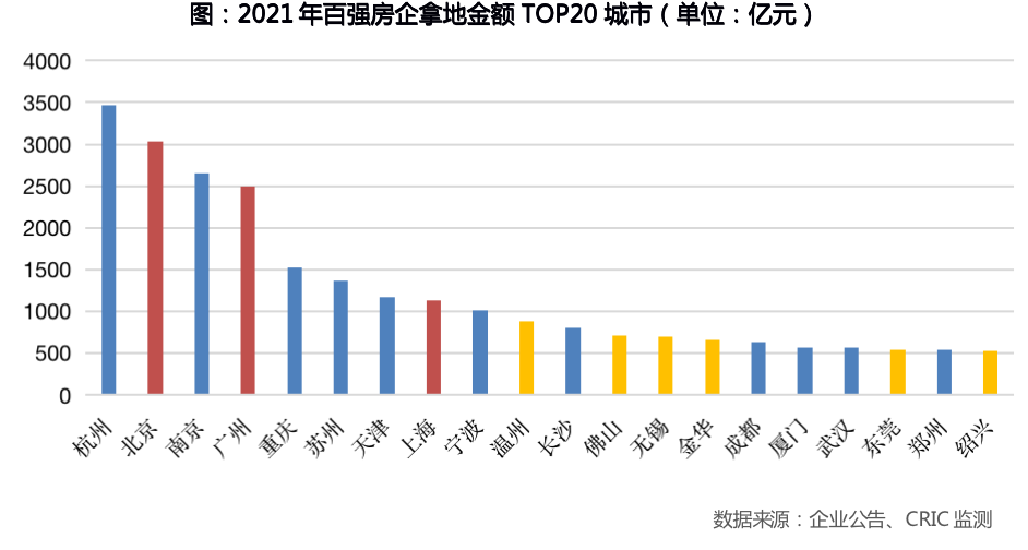 2021年,新增貨值百強門檻為214.4億元,同比微降3%,新增土地價值、新增土地建面的百強門檻分別為83億元和152.8萬平方米,其中金額同比上升13%,建面則降20%。新增土儲超過2000億的房企共有10家,較去年減少6家,可見在現金流持續吃緊的壓力下,企業投資力度明顯收緊。
