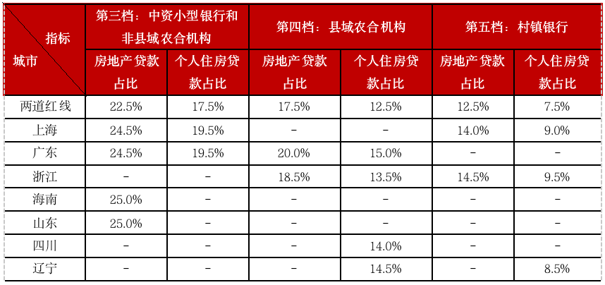 上海、廣東、浙江、海南、山東、四川、遼寧等多省市依規上調中小型銀行房貸占比上限,平衡好中小型銀行經營壓力和金融風險防控。例如上海第三檔和第五檔銀行的房貸占比上限分別提高2個百分點和1.5個百分點,又如廣東省第三檔和第四檔銀行的房貸占比上限分別提升2個百分點和2.5個百分點。