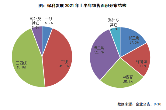 從銷售區域分布來看,2021年上半年保利發展銷售面積貢獻最大的區域為珠三角區域,占比達到32.7%,同比減少1.9各百分點;此外中西部區域銷售面積同比增長2.4各百分點至25.6%,增幅最大。