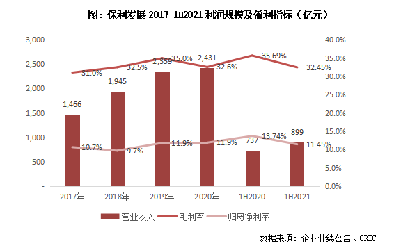 從盈利水平來看,2021上半年保利的毛利率為32.45%,同比減少3.42個百分點,凈利率和歸母凈利率也分別同比下降1.75和2.29個百分點至16.34%和11.45%,盈利水平雖有所下降但仍屬于行業高位。