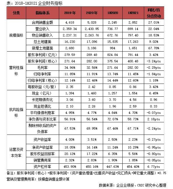 2021年上半年保利發展實現全口徑銷售金額2852億元,銷售面積1671萬平方米,分別同比增長27.0%和12.0%,銷售金額增速在TOP5房企中排名第二,銷售增速較快。得益于前幾年拿地權益的上漲,簽約建面權益比同比增長3.52個百分點至69.98%。