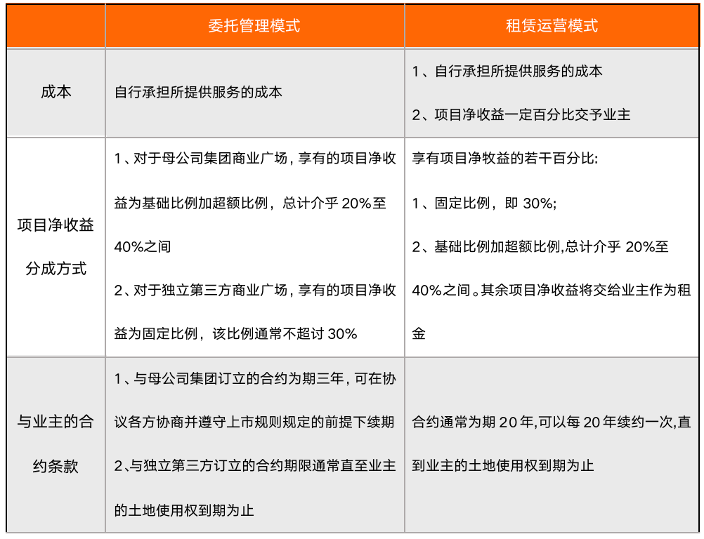 萬(wàn)達(dá)商管在運(yùn)營(yíng)模式上采用了委托管理和租賃運(yùn)營(yíng)兩種方式,其中委托管理模式主要表現(xiàn)為萬(wàn)達(dá)商管全權(quán)負(fù)責(zé)管理商業(yè)廣場(chǎng)。而租賃運(yùn)營(yíng)模式主要表現(xiàn)為從業(yè)主處承租,并將商業(yè)廣場(chǎng)內(nèi)的商業(yè)空間出租于商戶,同時(shí)全權(quán)負(fù)責(zé)管理商業(yè)廣場(chǎng)。