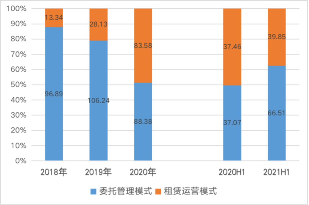 萬(wàn)達(dá)商管2018年至2020年的租賃運(yùn)營(yíng)模式收入得到快速增長(zhǎng),主要原因一是第三方管理項(xiàng)目的數(shù)量明顯增長(zhǎng),由2018年的23個(gè)增長(zhǎng)至2020的79個(gè);另一方面2020年由于嘗試將母公司旗下的55個(gè)項(xiàng)目也轉(zhuǎn)為租賃運(yùn)營(yíng)模式,因此當(dāng)年租賃運(yùn)營(yíng)模式收入占比大幅提升。不過(guò)目前企業(yè)280個(gè)母公司集團(tuán)商業(yè)廣場(chǎng)仍然轉(zhuǎn)為委托管理模式,僅118個(gè)在管獨(dú)立第三方商業(yè)廣場(chǎng)中有82個(gè)所采用的是租賃運(yùn)營(yíng)模式管理。