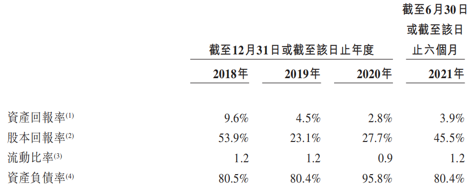 一是其較高的負(fù)債,招股書(shū)顯示,2018年至2020年,資產(chǎn)負(fù)債率分別為80.5%、80.4%、95.8%,2021年上半年資產(chǎn)負(fù)債率則為80.4%。整體資產(chǎn)負(fù)債率保持穩(wěn)定,2020年達(dá)到95.8%主要是因?yàn)槠湓诋?dāng)年派息達(dá)51.78億元。