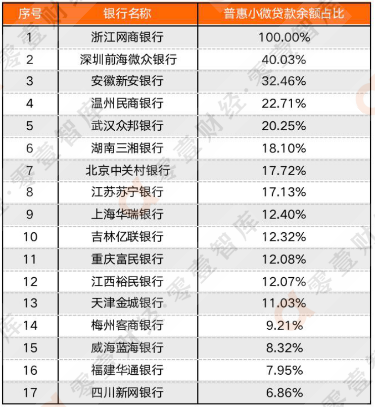 3、 浙江網商銀行和吉林億聯銀行數據來源于新京報、溫州民商銀行根據年報中“普惠小微貸款余額占比”測算所得。4、僅限各家銀行表內數據不含聯合貸。