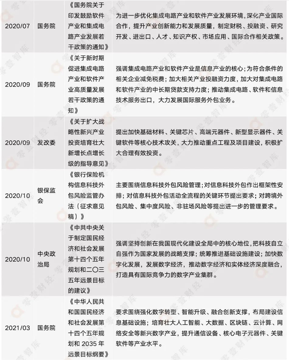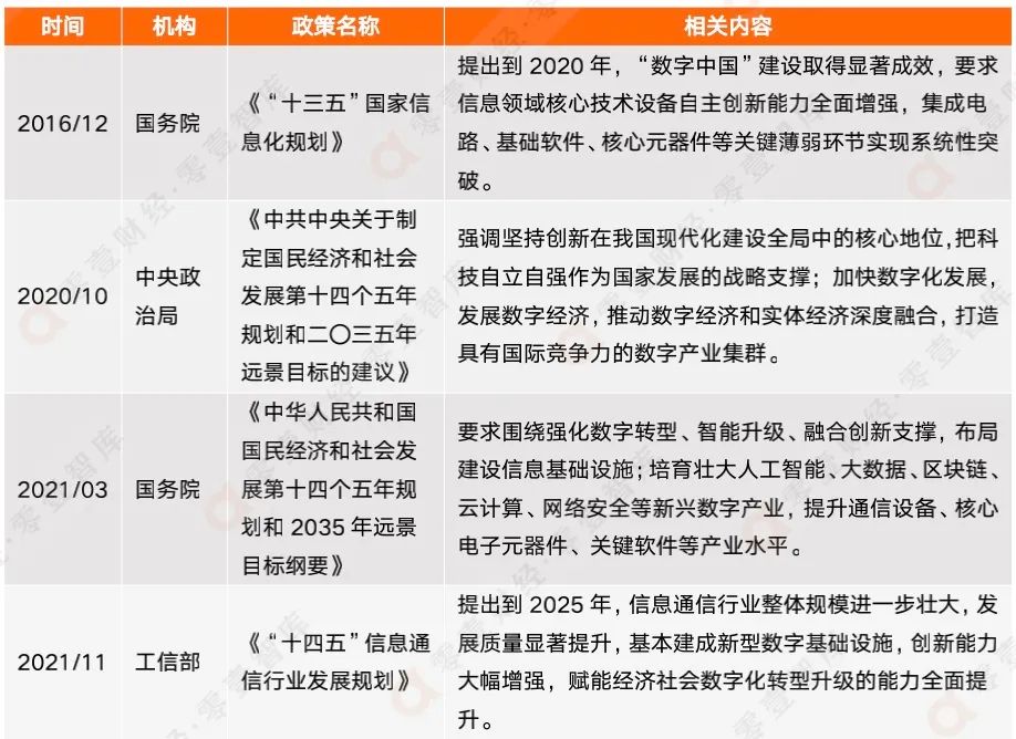 在2021年兩會期間,“數字化轉型”一詞多次被提到,并在《中華人民共和國國民經濟和社會發展第十四個五年規劃和2035年遠景目標綱要》中多次出現,可見其重要性。在2020年之前,數字化發展與信創早已有了聯系。2016年,國務院出臺《“十三五”國家信息化規劃》,要求到2020年,“數字中國”建設取得顯著成效,要求信息領域核心技術設備自主創新能力全面增強。2020年以后,中央更是直接提出“圍繞強化數字轉型”建設信息基礎設施,信創發展帶來“IT基礎設施”、“基礎軟件”、“應用軟件”、“信息安全”等方面的創新能力的提升,將賦能“經濟社會數字化轉型升級的能力全面提升”。