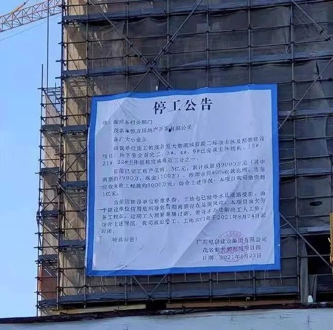 但是好兆頭并沒有能夠溢到城市的項目上。同一天,長沙恒大珺悅府工程部、恒大廣西公司、恒大山西公司相繼發(fā)布通知稱,因所在公司拖欠員工公積金及工資,現(xiàn)全體罷工,罷工期間所有業(yè)務停辦,具體復工時間待定。