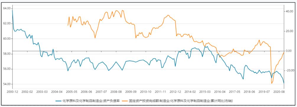 圖5 化工行業(yè)投資與行業(yè)資產(chǎn)負債率對比(單位:%)